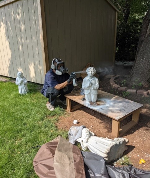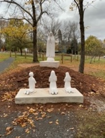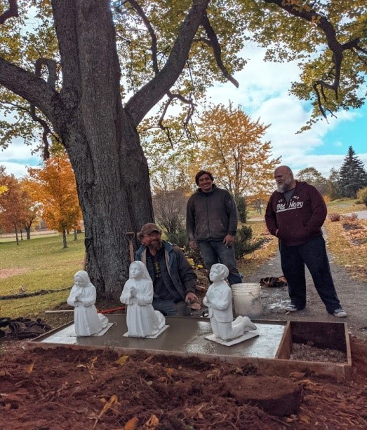 Members of the Knights of Columbus (Brady Grant, Phillip Beaulac and Luke Pierlot) volunteered to re-install the children while their organization supplied the materials. Other Knights Glen Mahar and Stephen LaPierre repaired, painted and re-installed the white cross on the entry sign to the Mount.
